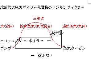 以前載せておいた図が有るので、ランキンサイクルの図を載せておきますね。飽和蒸気は熱伝導率が良いですし、過熱器の無いランキンサイクルはカルノーサイクルに近いと思えるのです。