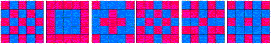 一方が赤、もう一方が青のパネルがあります。周囲をクリックすると、列または行が回転します。 このようなパターンを作ってみてください。下のプルダウンメニューで、4×4、5×5に変わります。5×5だとかなりいろいろなパターンが作れます。