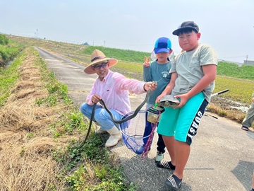 阿久比の川で川に棲む生き物の観察会を行いました。手長エビ、ハゼ、シジミ、アカミミガメ、水辺で休憩中のアオダイショウシなどの生き物が見れました